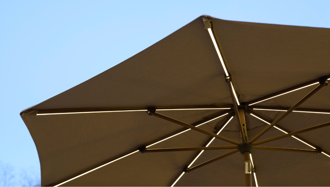 At night, the wireless rib-mounted LED light system casts a warm, inviting glow powered by a solar panel finial, offering up to 6 hours of illumination. A wireless puck remote makes it easy to light up the evening with just one click.