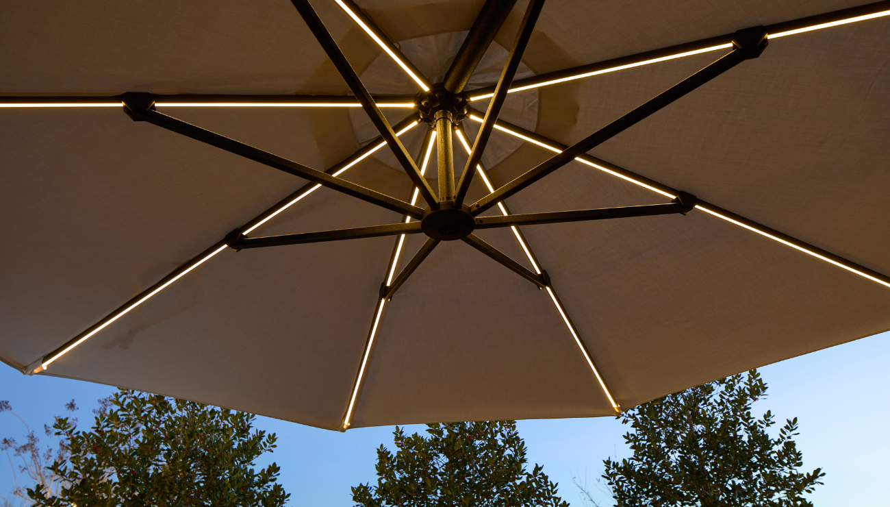 As the sun sets, the integrated solar-powered LED rib lights cast a warm, ambient glow — powered by the solar panel finial and easily controlled by the included wireless puck remote. No wires, no hassle. Just seamless light from above.